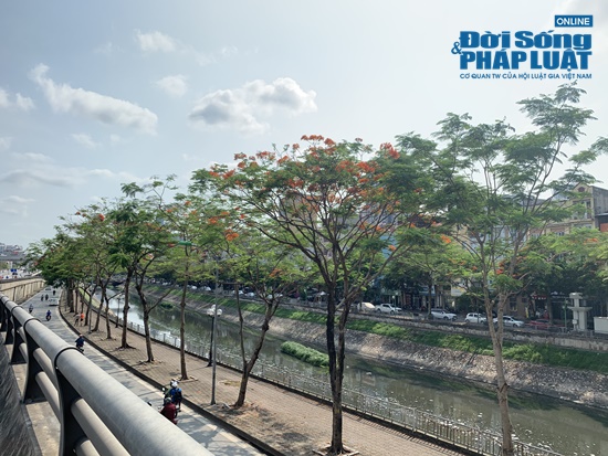Trên đường Nguyễn Ngọc Vũ, hàng chùm phượng đỏ lấp loáng trong tán lá xanh bỗng làm con đường ven sông Tô Lịch cũ kĩ trong trí nhớ của nhiều người trở nên thơ mộng. |