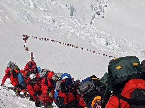 | Đoàn người nối đuôi nhau leo lên đỉnh Everest vào tháng 5 năm 2013. |