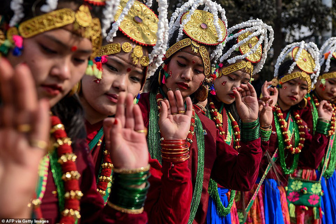Các thành viên của cộng đồng Gurung mặc trang phục truyền thống tham gia vào một buổi lễ mừng năm mới được gọi là 'Tamu Lhosar' ở Kathmandu. |