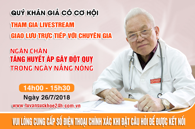 Để hiểu rõ hơn về bệnh tăng huyết áp và những mối đe dọa của nó, đặc biệt là nguy cơ gây đột quỵ não trong ngày nắng nóng, bạn đừng bỏ lỡ buổi tư vấn trực tiếp của GS.TS Phạm Gia Khải – Nguyên Chủ tịch Hội Tim Mạch Việt Nam trên Fanpage Tư vấn sức khỏe 24h lúc 14h00 ngày 26/07/2018 tới đây.