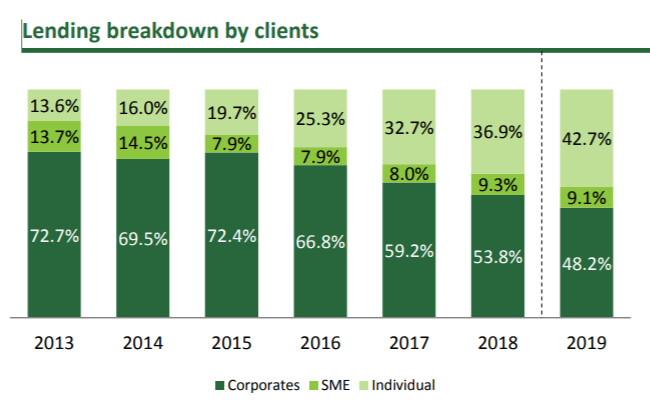 Nguyên do: trong bối cảnh lãi suất cho vay trên liên ngân hàng về gần 0%/năm, lãi suất cho vay bán buôn cạnh tranh về mức thấp, cho vay bán lẻ có tỷ lệ lãi biên cao hơn để nâng hiệu quả sử dụng vốn.