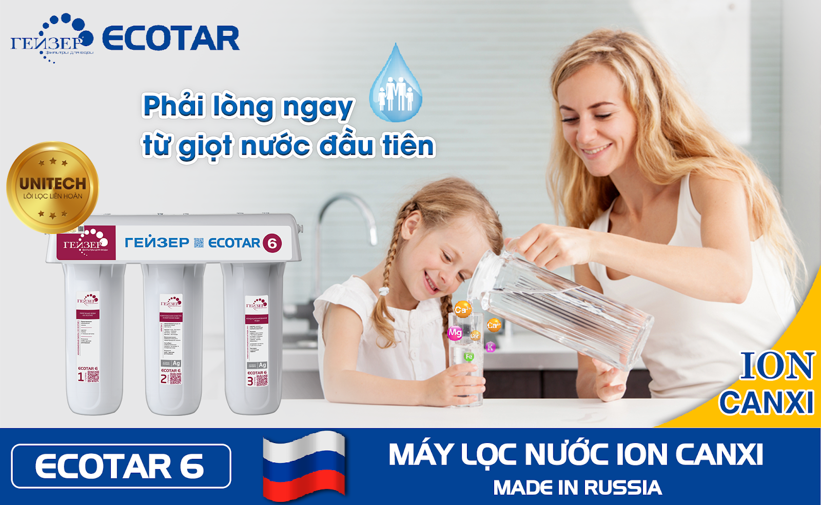 Máy lọc nước Ion canxi Geyser Ecotar 6 là thế hệ máy lọc nước nano mới nhất của Geyser LB Nga lần đầu tiên được tích hợp công nghệ lọc liên hoàn Uni TECH. Công nghệ lõi lọc liên hoàn sử dụng trong máy lọc nước ion canxi Geyser Ecotar là công nghệ với các lõi lọc được thiết kế không thể tách rời. Khi thay thế người dùng cần thay thế trọn bộ cả 3 lõi lọc cùng lúc, không thể thay thế riêng lẻ. Thời gian thay thế trọn bộ cả 3 lõi lọc là 12 tháng, tương đương với 7000l nước.
