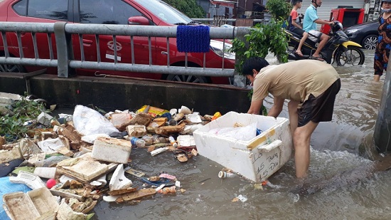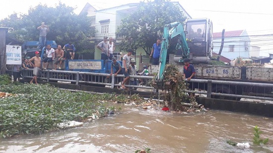 Để thoát nước, người dân đã huy động xe cuốc đất để móc hết rác đang tồn đọng tại cầu rạch, sông ngòi để khai thông dòng chảy.