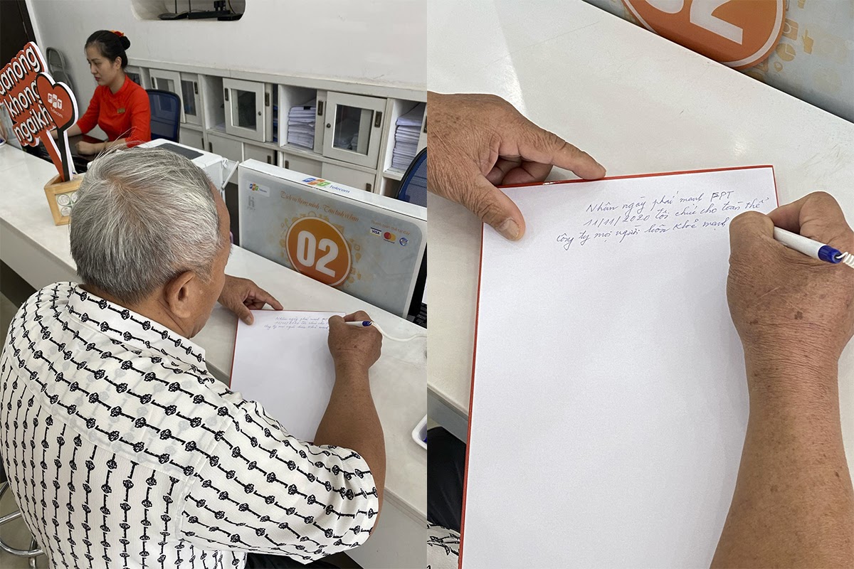 Không bày tỏ hết cảm xúc bằng lời nói, bác Cao Hoàng Hùng (72 tuổi, TP Hạ Long) có cách biểu lộ tâm tư khiến các giao dịch viên trong văn phòng giao dịch FPT Telecom chi nhánh Quảng Ninh không khỏi xúc động. Dù đã vào độ tuổi “xưa nay hiếm”, bác vẫn nắn nót những dòng tâm thư nhắn nhủ: “Nhân ngày phái mạnh FPT tổ chức, tôi chúc cho toàn thể công ty mọi người đều khỏe mạnh vui vẻ, luôn đổi mới phong cách làm việc để công ty phát triển, phủ sóng trên toàn quốc và sánh vai với các công ty khác, kết nối mọi niềm vui cho mọi người”.