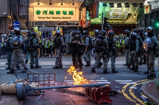 Lực lượng cảnh sát Hong Kong được triển khai trong ngày đầu áp dụng Luật an ninh quốc gia. Ảnh: AFP |