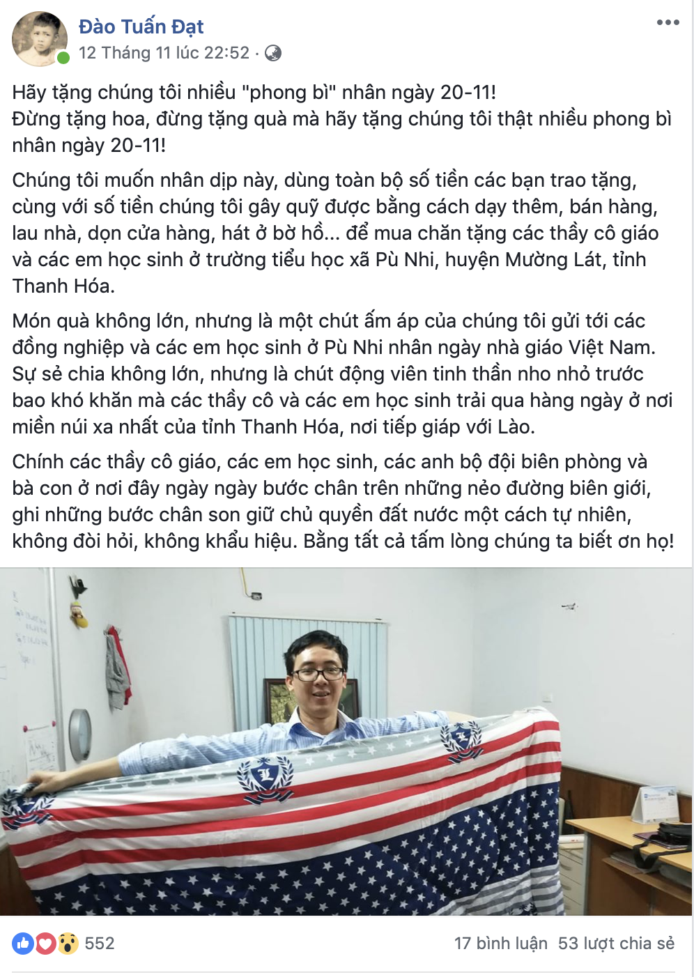 Đừng vội bình luận ác ý về chuyện thầy giáo kêu gọi “hãy tặng chúng tôi nhiều phong bì” khi chưa hiểu hết bản chất của câu chuyện. Mấy ngày gần đây, nhiều người nhắc nhiều đến thầy Đào Tuấn Đạt cùng các giáo viên khác của trường THPT Anhxtanh (Hà Nội) đã đồng loạt đăng tải dòng trạng thái: "Đừng tặng hoa, đừng tặng quà mà hãy tặng chúng tôi thật nhiều phong bì nhân ngày 20/11!" trên trang cá nhân. Nhiều người đã giật mình trước thông điệp này. Nhiều anh hùng bàn phím vốn quen lướt web, nhìn title mà chẳng quan tâm đến nội dung đã vung tay múa phím với đủ lời… phê bình sâu sắc.