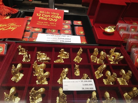 Theo quan sát của PV, mẫu mã vàng năm nay được các cửa hàng chuẩn bị rất công phu. Trong đó, bộ lộc vàng in hình 12 con giáp, đồng xu in hình gà, các sản phẩm vàng liên quan đến tâm linh... thu hút được rất nhiều người mua. Ngoài ra, các mặt hàng như vàng miếng, nhẫn tròn trơn... cũng được nhiều người tiêu dùng tìm mua.