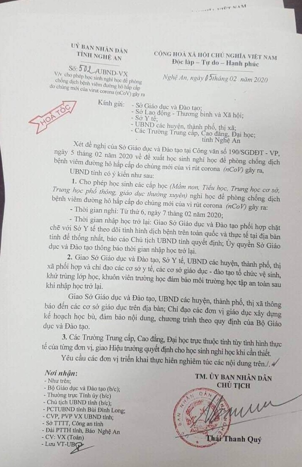 Chiều ngày 5/2, UBND tỉnh Nghệ An đã có công văn hỏa tốc cho học sinh toàn tỉnh nghỉ học từ ngày 7/2 để phòng chống dịch do nCoV gây ra.