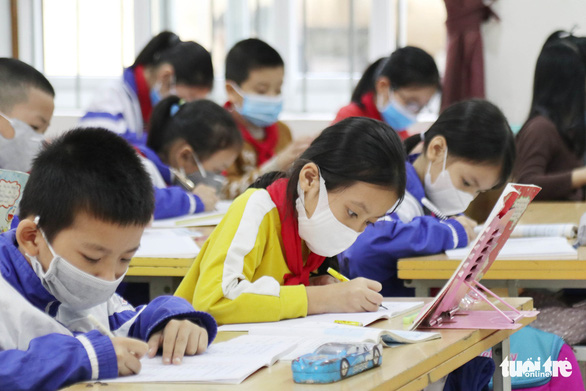 Học sinh Trường tiểu học Trung Đô, TP Vinh, Nghệ an đeo khẩu trang trong giờ học sáng 5/2 - Ảnh: Tuổi trẻ |