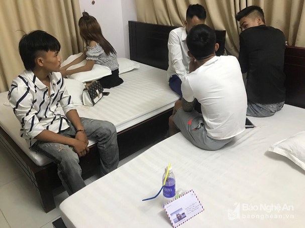Tại một phòng trong khách sạn Vườn Dứa, lực lượng chức năng phát hiện 5 đối tượng (4 nam và 1 nữ tuổi từ 18 đến 22); trong đó có 2 đối tượng trú tại Nghệ An, 3 đối tượng trú tại huyện Tĩnh Gia (Thanh Hóa) đang có hành vi sử dụng trái phép chất ma túy.