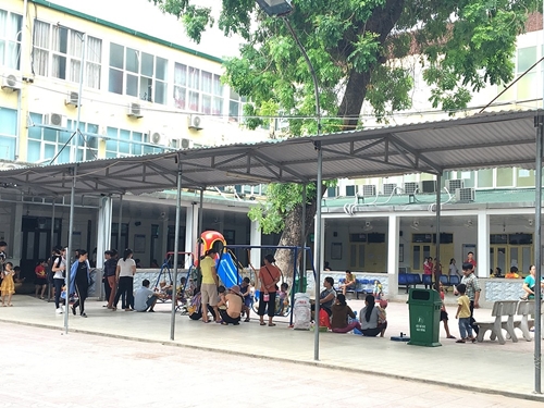 Nhiều phụ huynh phải đưa con nhỏ xuống khuôn viên bệnh viện chơi để hóng mát. |