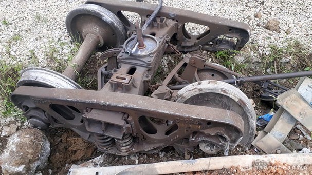 Bánh ray của tàu bị trật, bay xuống đường. Ảnh: Báo Nghệ An |