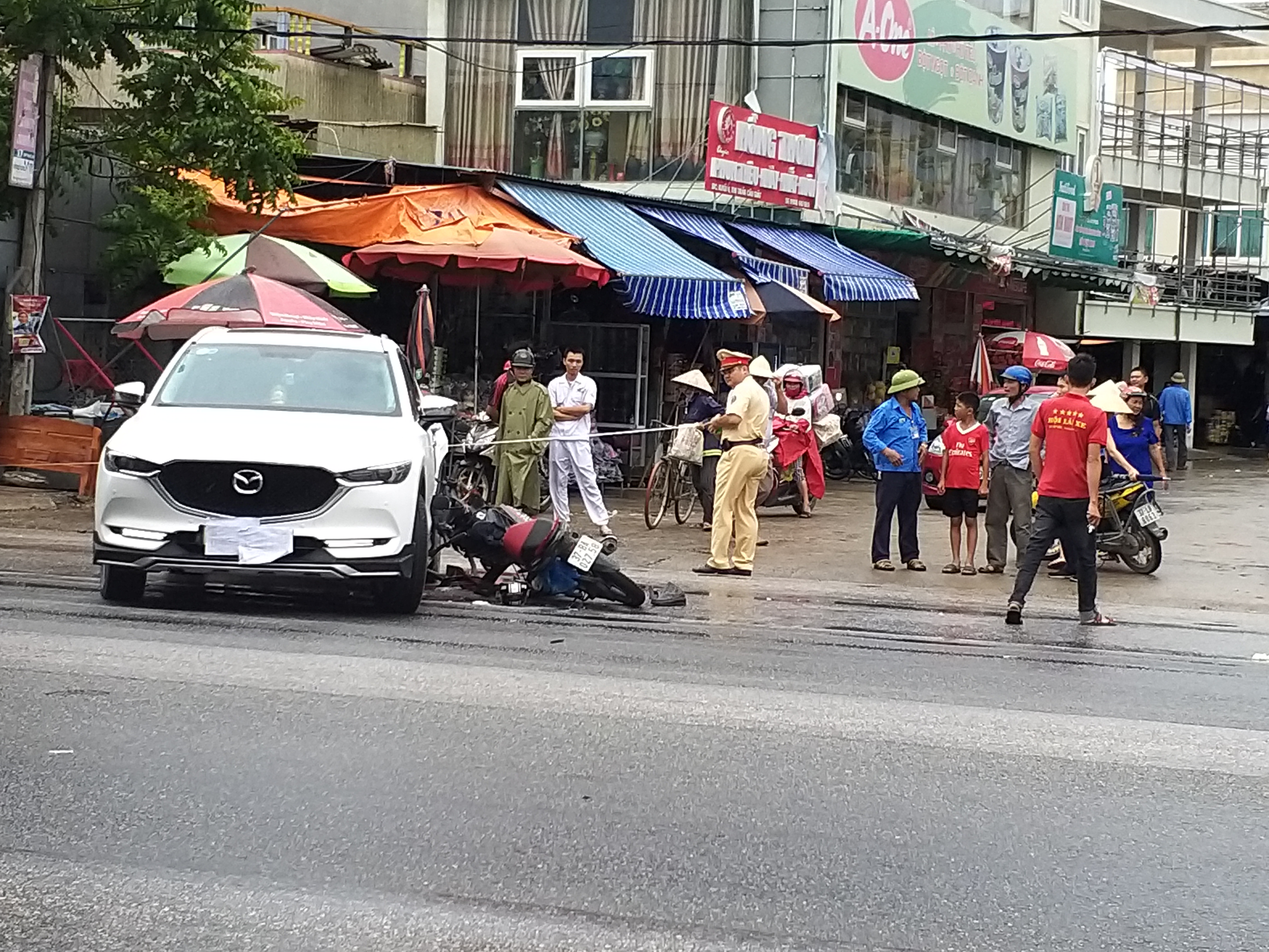 Cú đâm mạnh khiến 2 nam thanh niên đi xe máy văng xuống đường gãy tay và chân, chấn thương vùng đầu, được người dân đưa đi cấp cứu.