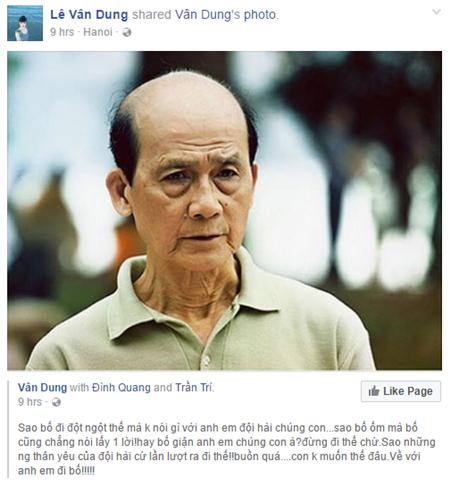 Vân Dung - người đã có nhiều năm diễn xuất cùng cố nghệ sĩ Phạm Bằng nghẹn ngào: "Sao bố đi đột ngột thế mà không nói gì với anh em đội hài chúng con? Sao bố ốm mà bố cũng chẳng nói lấy 1 lời, hay bố giận anh em chúng con à? Đừng đi thế chứ! Sao những người thân yêu của đội hài cứ lần lượt ra đi thế? Buồn quá....con không muốn thế đâu. Về với anh em đi bố!!!!!"