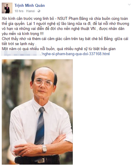Vậy mà 8h tối nay khi nhà báo Tùng Long và nhiều nhà báo gọi điện con đã sốc thực sự, buồn lắm bố Bằng ạ! Nhiều anh chị em nghệ sĩ chúng con nhớ bố lắm, và sẽ sốc thực sự. Bởi bao nhiêu kỷ niệm, bao nhiêu điều học hỏi từ những thế hệ như bố mà chúng con vẫn ngưỡng vọng noi theo.