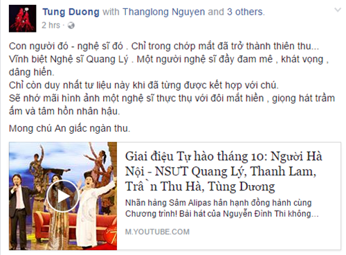 Nam ca sĩ Tùng Dương chia sẻ lại màn trình diễn của anh cùng NS ƯT Quang Lý khi tham gia chương trình Giai điệu tự hào với lời giãi bày: "Con người đó - nghệ sĩ đó . Chỉ trong chớp mắt đã trở thành thiên thu...