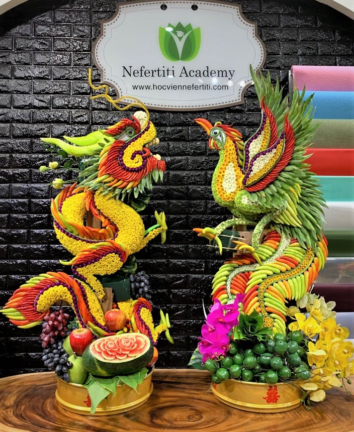 Cặp rồng phượng được tạo hình nghệ thuật từ rau, hoa, củ, quả do Học viện Nefertiti thực hiện |