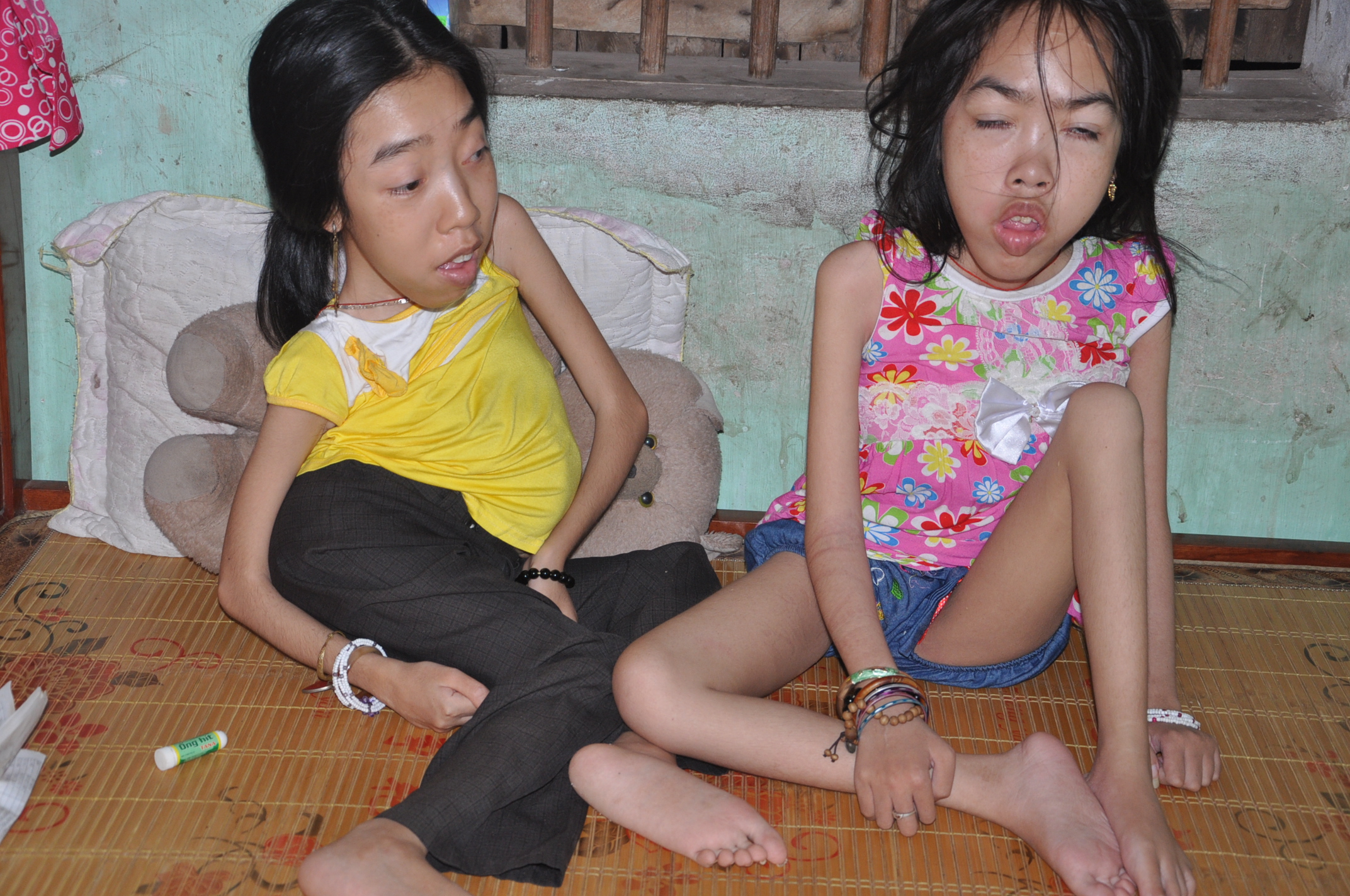 Khi được biết chúng tôi đến thăm hai em, một trong hai cô bé đang ngủ đã tỉnh dậy giọng gọi với: “Chị đến thăm chúng em thật ạ, chị ngồi đây, ngồi trên giường cạnh em này để nói chuyện với em nhé”. Rồi giọng em líu lo, trái ngược hẳn với cái thân hình èo uột, cong queo không rõ ràng các bộ phận. “Em tên là Thành chị ạ, chị gái em là Son nhưng mà chị ấy còn đang ngủ vì cứ đêm là lên cơn động kinh nên thành ra toàn ngủ ngày”.