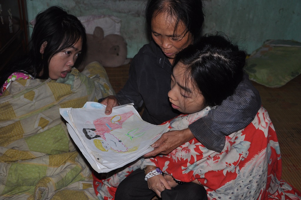 Rồi chị tâm sự những ngày ôm hai con lê lết ở hết bệnh viện huyện Đan Phượng đến Bệnh viện Nhi TW rồi sang cả Xanh – Pôn, ai nhìn thấy cũng thương, có người còn bảo: “Bỏ hai đứa ở viện mà về chứ con cái thế kia nuôi sao được” – chị nhớ lại. Nhưng: “Đã mang nặng đẻ đau chúng, nó có thế nào thì vẫn là con của tôi cô ạ, mang nó về đói thì cùng đói, no thì cùng no để không phải tội với đời, với mình nữa”, người mẹ ngậm ngùi.