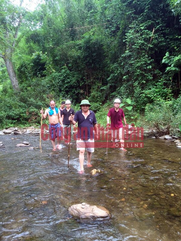 | Thiếu tướng Hồ Sỹ Tiến, Cục trưởng Cục Cảnh sát hình sự dẫn đầu tổ công tác lội suối vào hiện trường vụ án. |