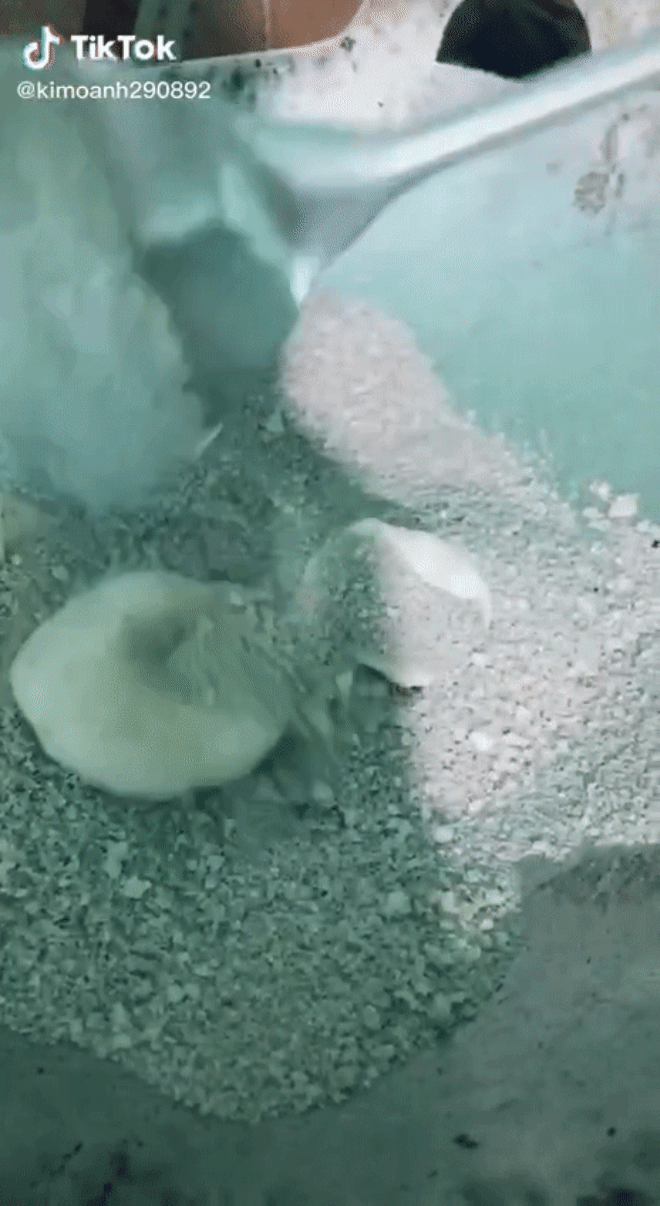 Thay vì sử dụng dầu như cách chiên phồng tôm thông thường thì cô gái này lại sử dụng muối để rang. Muối nóng được đổ liên tục lên những chiếc bánh phồng tôm, làm bánh phồng và chín giòn tan. Chưa kể, với cách làm này những chiếc bánh phồng tôm còn được bám một lớp muối mỏng, tạo vị mặn nhẹ dễ ăn hơn.