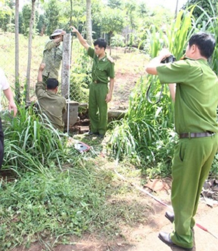 Cạnh đó là nhiều gậy gộc, một bao tải bên trong chứa dây thòng lọng, ớt bột, pin độ chế kích điện, đèn pin, ná cao su, nhiều viên đá nhỏ... Một sợi dây điện rất dài đứt nằm trong rẫy của một người dân.