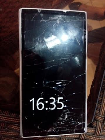 | Chiếc điện thoại đã bị vỡ màn hình sau cú vung tay của ông Dong. |