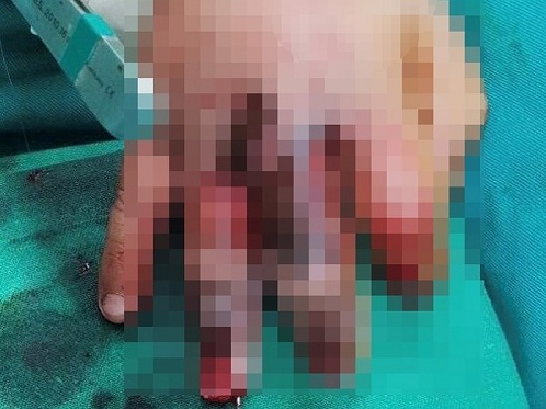 Qua thăm khám, ba ngón 3-4-5 bàn tay trái của bệnh nhi bị dập, gần đứt lìa, chảy máu nhiều. Các bác sĩ tại khoa Chấn thương - Chỉnh hình - Bỏng tiến hành phẫu thuật cắt lọc và khâu nối gân cơ, mạch máu, kết hợp xương các ngón tay.