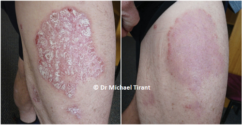 Nghiên cứu cho thấy liệu trình điều trị trên không có tác dụng trên 22 bệnh phân (3,1%) trong tổng 722 bệnh nhân; 84 bệnh nhân (11,6%) cải thiện mức độ trung bình với diện tích da hồi phục chiếm 51 - 75% vùng tổn thương; 484 bệnh nhân (67%) có mức cải thiện vượt bậc với tổng diện tích da hồi phục 76-100%, 52% trong số đó đạt mục tiêu hồi phục hoàn toàn. 12 bệnh nhân diễn biến nặng lên và ngừng điều trị; 18 bệnh nhân ngừng điều trị do không tuân thủ điều trị; 33 bệnh nhân có tác dụng phụ là viêm nang lông.