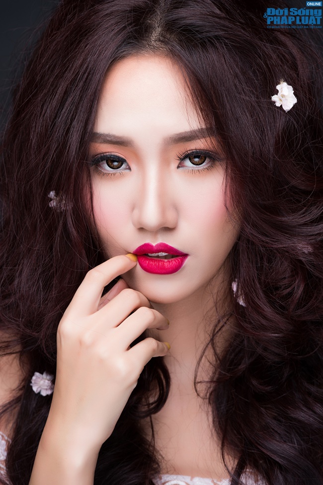 Dù dùng son đỏ hồng hay cam, đôi môi của Trà My cũng dược Tina dùng những đường cong tạo hình trái tim thật gợi cảm. |