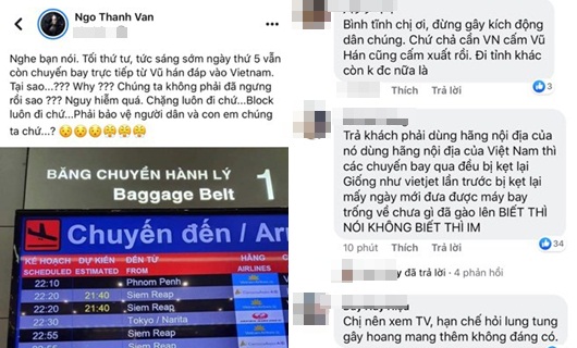 Một cư dân mạng viết: "Bình tĩnh chị ơi, đừng gây kích động dân chúng. Chứ chả cần Việt Nam cấm, Vũ Hán cũng cấm xuất rồi. Đi tỉnh khác còn không được nữa là". Nhiều người khác cũng lên tiếng: "Chị nên xem tivi, đọc các thông tin chính thống , hạn chế hỏi lung tung gây hoang mang thêm không đáng có", "Lại nghe bạn nói. Tìm hiểu rõ rằng rồi post bài nha chị"...