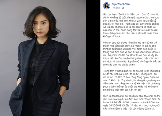 Ngô Thanh Vân giãi bày: "Việc tôi bức xúc trước hình ảnh kia là vì từ khi trở thành nhà sản xuất phim, sứ mệnh tôi đặt ra cho mình là quảng bá văn hóa Việt Nam đến quốc tế, thông qua điện ảnh và các dự án khác nhau, đơn cử như bộ phim “Cô Ba Sài Gòn” trước đây, vì vậy khi thấy chiếc Áo Dài truyền thống được mặc một cách sai lệch, tôi cảm thấy rất phẫn nộ vì công sức bảo vệ chiếc áo dân tộc bị xúc phạm".