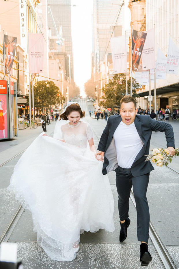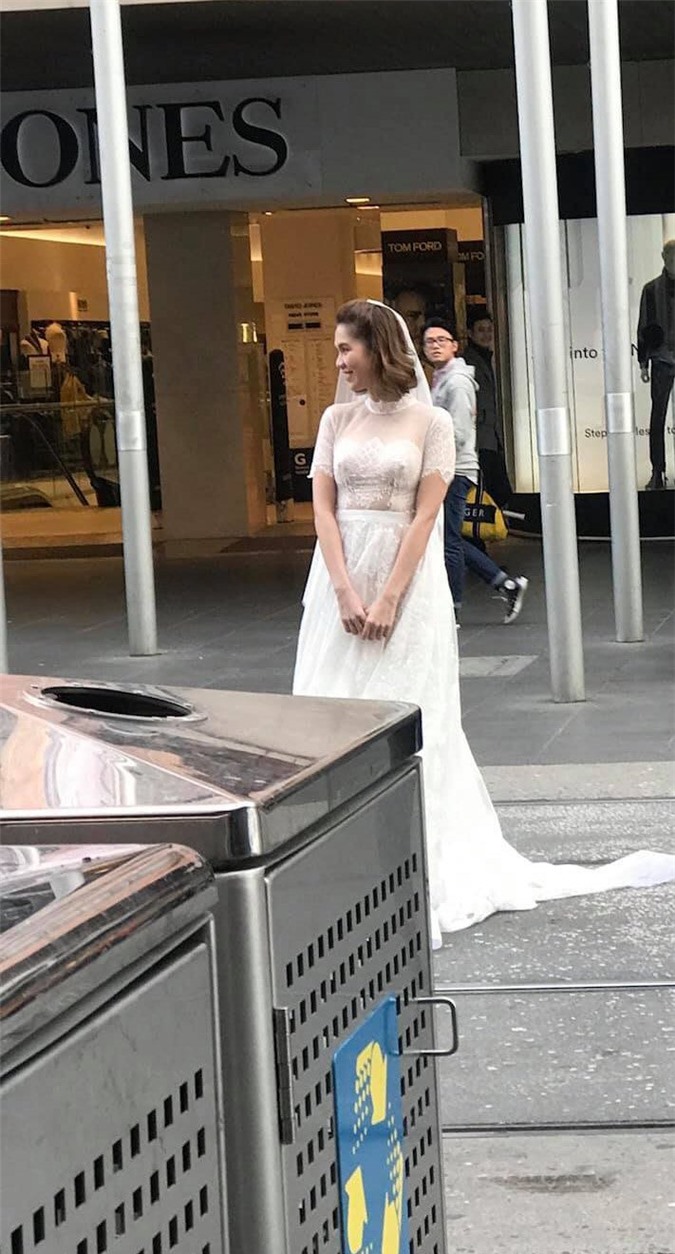 Trong một bức ảnh chụp trộm, Ngọc Trinh để lộ vóc dáng có phần mũm mĩm khi diện váy cưới giữa phố.
