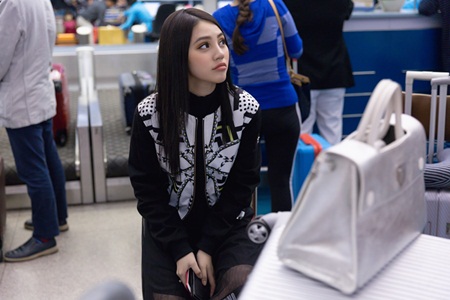 Ngay sau lựa chọn thêm những mẫu trang phục phù hợp, Jolie Nguyễn ngay lập tức sắp xếp hành lý để kịp di chuyển ra sân bay. Xuất hiện nổi bật ở sân bay với áo khoác và áo cổ lọ Versace Jeans, cô kết hợp cùng chân váy Moschino, giày Gucci tạo vẻ nữ tính nhưng không kém phần năng động.