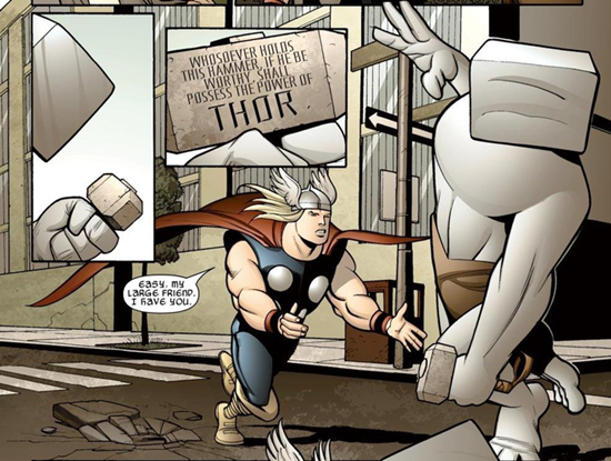 Không phải ngẫu nhiên mà trong phim - chỉ mình Captain America khiến búa Thor nhúc nhích. Theo đó, trong truyện tranh, cụ thể là “The Mighty Thor số 390” (1988) và “Fear Itself số 7” (2011), Captain America cũng đã từng nhấc được chiếc búa thần của Thor.