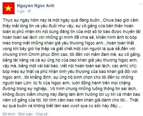 “Thực sự ngày hôm nay là một ngày quá đáng buồn... Chưa bao giờ cảm thấy mất lòng tin và yếu đuối như vậy, sự cố gắng của bản thân hoàn toàn bị phủ nhận khi nội dung đăng tin của một số tờ báo được truyền tải hoàn toàn sai lệch với những gì mình đã chia sẻ, khiến hình ảnh bị bóp méo trong mắt những khán giả yêu thương Ngọc anh...hoàn toàn thất vọng khi bây giờ hạ thấp và giết chết một con người là quá dễ, đến với chương trình Chinh phục đỉnh cao, tôi đến với niềm đam mê, sự cố gắng, bằng tài năng và cả sự ủng hộ của bao khán giả yêu thương Ngọc anh, vậy mà, bằng một vài bài báo, viết nội hoàn toàn sai lệch, các anh( chị) bóp méo sự thật và phủ nhận tình yêu thương của bao khán giả đối với Ngọc anh...tôi khẳng định, sự ủng hộ bình chọn cho tôi đến từ những người bạn Lớn, từ fc của Ngọc anh, luôn đồng hành trên mọi chặng đường trong sự nghiệp... Vô hình chung những luồng thông tin sai lệch, không được kiểm chứng này đang làm ảnh hưởng tới uy tín cá nhân bao năm cố gắng của tôi, tới tình cảm bao năm khán giả dành cho tôi... Thật sự quá buồn và không biết làm sao vượt qua cú sốc này đây...”, Ngọc Anh viết.