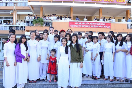 Tại buổi gặp gỡ và giao lưu cùng thầy cô và học sinh của trường, hoa hậu Ngọc Duyên diện áo dài trắng tinh khôi, cô cho biết, khi mặc áo dài trắng, về lại trường xưa khiến cô rất xúc động.