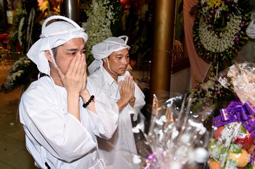Ngọc Sơn ôm mặt khóc trước bàn thờ cha. Trước đó, do khóc nhiều, anh bị đau mắt. Bà Kim Loan - mẹ nam ca sĩ cho biết, con trai cả sụt 7 kg từ khi cha đổ bệnh.