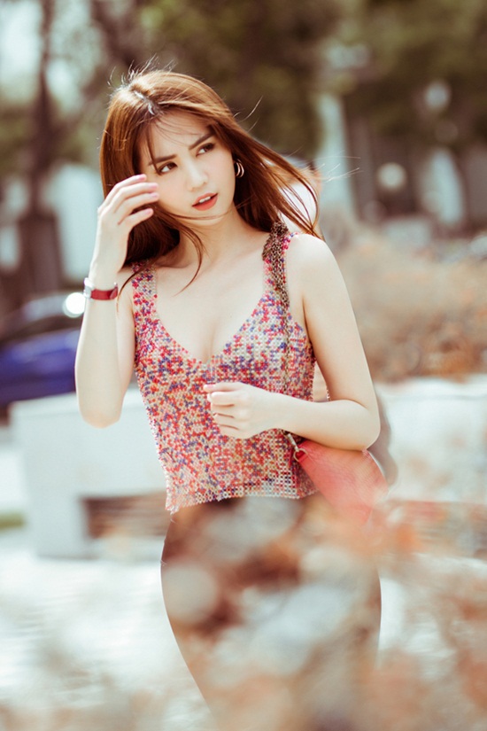 Gương mặt có phần ngây thơ, làn da trắng mịn của Ngọc Trinh khiến cô chinh phục mọi trang phục. |