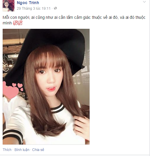 Cách đây ít hôm, người đẹp cũng đã chia sẻ hình ảnh mới của mình trên trang cá nhân. Bức ảnh này thu hút rất nhiều sự chú ý của mọi người. Và cũng có rất nhiều ý kiến chê bai về diện mạo mới và tỏ ra không thích sự thay đổi này của Ngọc Trinh. Tuy nhiên, tất cả đều tán đồng rằng Ngọc Trinh trong bức hình này giống hệt búp bê Nhật Bản.