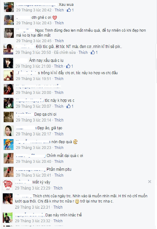 Nhìn vào bức ảnh mới có thể thấy Ngọc Trinh thay đổi khá nhiều không còn quyến rũ và gợi cảm như trước. Kiểu tóc ngôi giữa bồng bềnh màu đen, xõa đều hai bên đã được thay thế bởi tóc mái lưa thưa được nhuộm màu tóc mới. Mặc dù, kiểu tóc mới này giúp Ngọc Trinh trẻ trung, xì tin hơn nhưng nhiều người cho rằng phần mái "lưa thưa" không hợp với Ngọc Trinh và khiến cô trở nên kém sắc hơn.
