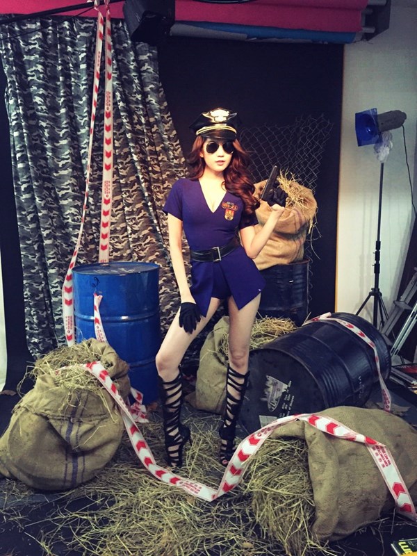 Trong bộ ảnh này, người đẹp tiếp tục chiến dịch khoe đường cong với trang phục bó sát của nhân vật trong game và trang phục nữ cảnh sát quyến rũ khoe làn da trắng cùng chân dài, đặc biệt là 3 vòng chuẩn của mình.