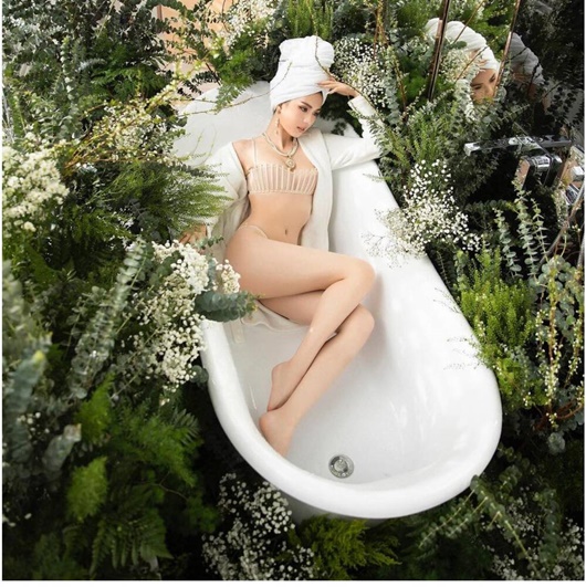 Concept chụp ảnh với bồn tắm cùng cây cỏ hoa lá bao quanh không mới nhưng Ngọc Trinh vẫn khiếp người xem khó lòng rời mắt khỏi màn hình. |