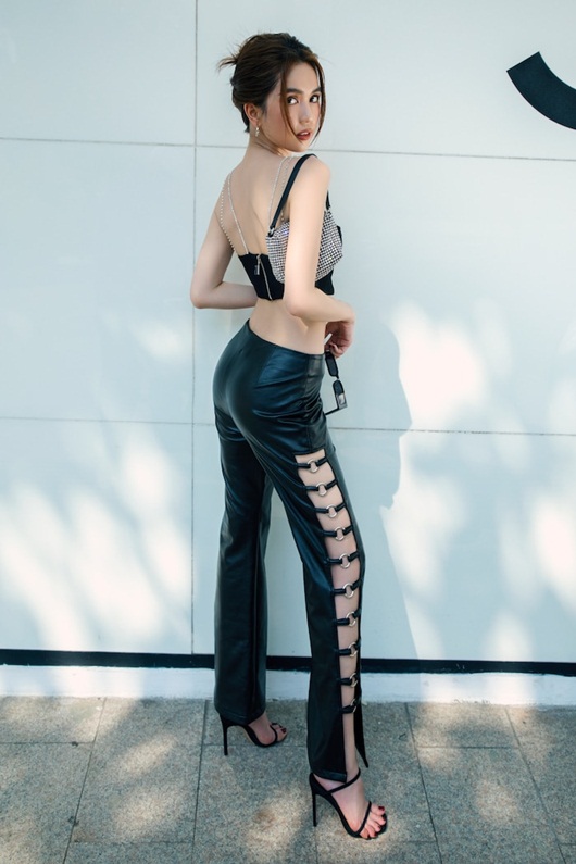Bra-top hai dây màu đen tinh tế được Ngọc Trinh phối với quần da xẻ dọc khá cao từ phần đùi. |