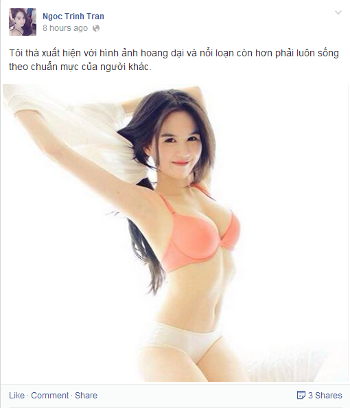 (ĐSPL) - Mới đây, Ngọc Trinh chia sẻ bức ảnh diện nội y gợi cảm với dòng mô tả: “Tôi thà xuất hiện với hình ảnh hoang dại và nổi loạn, còn hơn phải luôn sống theo chuẩn mực của người khác”, đã gây nhiều chú ý từ phía công chúng.