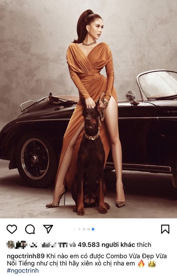 Ngọc Trinh được cho là dằn mặt ai đó khi tiếp tục đăng tải dòng trạng thái ít phút sau đó: "Khi nào em có được combo vừa đẹp vừa nổi tiếng như chị thì hãy xiên xỏ chị nhé em".