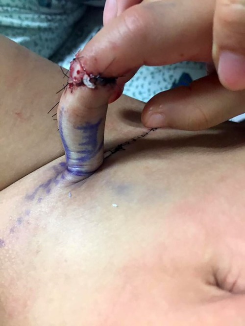 Tại đây, bác sĩ phẫu thuật đã mất 3 giờ để cấy ngón tay bị đứt 1 nửa vào bụng cậu bé bằng cách gói nó lại bằng một vạt da.