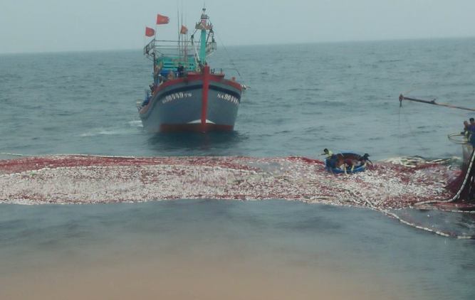 Theo đó, vào rạng sáng 4/1, tàu của ngư dân Trần Văn Thiên (34 tuổi), trú tại thôn Đại Hải, xã Quỳnh Long, huyện Quỳnh Lưu (Nghệ An) đang đánh bắt ngoài khơi thì trúng một mẻ cá dày đặc.