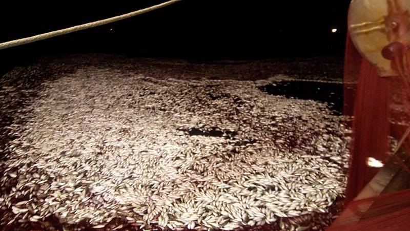 Cá nổi lên mặt nước trắng xóa, được cho là loài cá căng và ước tính mẻ lưới có gần trăm tấn cá.