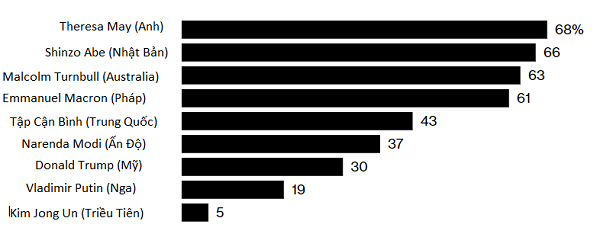 Khoảng 30% người Australia tin rằng Trump sẽ “làm điều đúng đắn trong các vấn đề thế giới”. Tổng thống Mỹ đứng thứ 7 trong số 9 lãnh đạo được xếp hạng trong bảng khảo sát, đứng sau Thủ tướng Anh Theresa May (68%), Chủ tịch Tập Cận Bình (43%) và trước Tổng thống Vladimir Putin của Nga (19%) cũng như Lãnh đạo Kim Jong-un của Triều Tiên (5%).